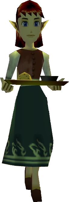 Before the afternoon of the First Day, Anju cooks a meal for her grandmother, who resides on the first floor. Anju's Grandmother feigns senility in order to avoid having to eat Anju's terrible cooking. Anju takes the food tray with her to the Staff Room, where she apparently eats the food herself as she is not seen bringing the tray with her when she leaves. If Anju is spoken to after 2:00 PM on the First Day, she will mistake Link for a Goron who has made a reservation under the name "Link." Link is given the Room Key to the Knife Chamber on the second floor, allowing him to enter the inn after closing time. When the Goron arrives to claim his reservation, he introduces himself as "Link-Goro" (the "-goro" suffix being a verbal tic inherent in some Gorons), which is not listed in the book of reservations. As a result, Link the Goron is made to sleep out in the street. Strangely, if Link does not claim his reservation, the Goron will introduce himself under his proper name and be given his Room Key. If Link approaches Anju before 2:00 PM, she will state that the inn is fully booked and there are no reservations, making it impossible to obtain the Room Key during the current three-day cycle.
