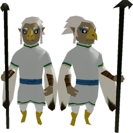 Basht and Bisht are characters from The Legend of Zelda: The Wind Waker. Two identical Rito living on Dragon Roost Island, they are both very honest and dutiful Rito, and thus have found their place as the policemen of the island. They both seem very serious in appearance, but they are often wishing Link well on his journeys and are always very considerate.