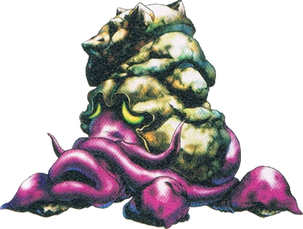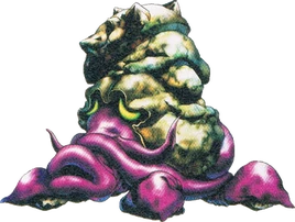 A Bigocto appears as the mini-boss of Inside Jabu-Jabu's Belly. After carrying Princess Ruto through the dungeon, Link comes across a room that holds the Zora's Sapphire. After throwing Ruto onto the tall platform, she retrieves her stone; however, shortly thereafter, the platform rises up from the ground to the floor above. Ruto is taken away, and in her stead appears the Bigocto. After its defeat, Link is able to use the platform to advance through the dungeon.