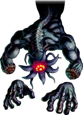 Bongo Bongo is a gargantuan, invisible, and evil spirit, appearing as a one-eyed monster with disembodied hands and a black-purpleish colorization. Prior to the game's events, it was sealed away by Impa in the bottom of the Well of Three Features in Kakariko Village. However, when Ganondorf assumes power, Bongo Bongo eventually breaks the seal placed on it and sets Kakariko Village on fire. Link arrives just as Bongo Bongo escapes, but fails to stop it from traveling to the Shadow Temple.