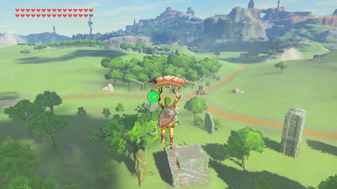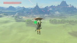 Link paragliding over one of the many ruins located throughout Central Hyrule