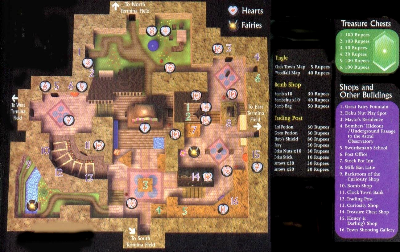 Clock Town is divided into five different areas: East Clock Town, North Clock Town, South Clock Town, West Clock town, and the Laundry Pool.