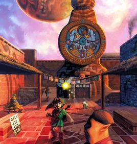 Clock Town is a city in The Legend of Zelda: Majora's Mask. It is both the geographic and economic center of Termina. It is a large town, comprised of five sections, North, South, East, and West Clock Town, and the smaller Laundry Pool. As the three days progress, the citizens of Clock Town will gradually desert the town, due to the moon above; on the Night of the Final Day, the entire city will be deserted, save for a few residents believing the moon will not fall.