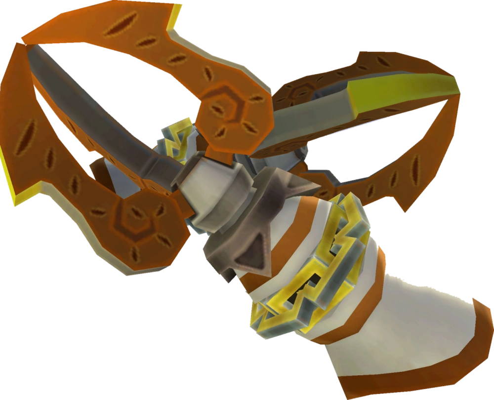 The Double Clawshots, also known simply as the Clawshots, are recurring items in the Legend of Zelda series. They are a pair of interchangeable Clawshots that function together. The Double Clawshots enable Link to grapple onto two targets by hanging off one and using the second Clawshot to grapple another target.