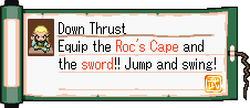 Link can use the Downthrust in conjunction with the Roc's Feather or a cannon by pressing B while airborne. This will cause Link to pause for a moment and then rapidly descend. When Link hits the ground he sends shock waves across the screen and can break cracked rocks. While the game is in side-scrolling view, Link can become airborne and use the Downthrust simply by walking off an edge and pressing B. Holding left or right while airborne in side view however will result in a downward sword slash instead of a Downthrust, and will not affect Link's movement or break cracked rocks. The Downthrust is required to deal the ending blow against two bosses; Frostare and Vaati.