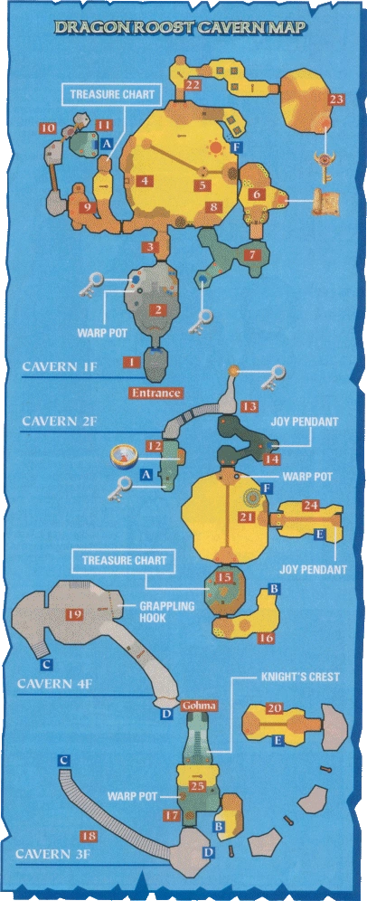The dungeon spans most of the inside and some of the outside of Dragon Roost Island. The dungeon is fire themed; Link needs the Water Pot in order to safely navigate the lava pools. The dungeon has one large, main room covering several floors, with ledges and a bridge higher up above the lower floor. Some rooms have doors leading to the outside; often Link must go outside the cavern to climb up stairs on the side of the island and reenter the cavern through another door. The highest set of stairs on the outside crumble as Link climbs them, requiring the use of the Grappling Hook to safely get down. At the top of the highest stairs, Valoo can be seen, breathing fire and obviously angry. Directly below waits the dungeon's boss, Gohma.