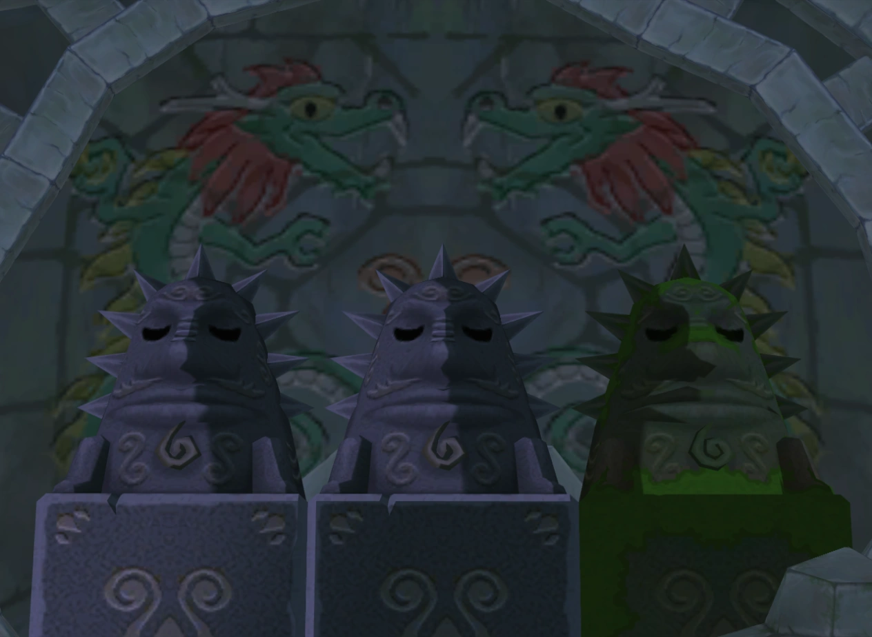 The mural and statues found in the entrance hall of the Dragon Roost Cavern