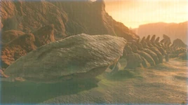 The Eldin Great Skeleton is a location from The Legend of Zelda: Breath of the Wild. It is located in the Eldin Mountains region of Hyrule. It is one of the three leviathan skeletons found in the game. A Great Flameblade can be found lying under the skeleton's skull, and a Moblin wielding a Flameblade and a Knight's Shield along with a Lizalfos and some Bokoblins patrol the area. The Dragon spirit Dinraal starts its journey from Eldin Mountains to Tanagar Canyon at sunrise near the Great Dragon Skeleton.