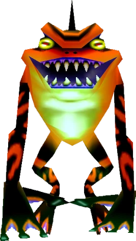 Gekkos are mini-bosses from The Legend of Zelda: Majora's Mask. These monsters are encountered twice; once in Woodfall Temple and another in Great Bay Temple. Gekkos are fast and agile; able to leap high and cling to walls. Link must combine his sword skills and timing in order to reliably strike them. When in battle, Gekkos will call in reinforcements after taking enough damage. When Gekkos are defeated, they turn into normal frogs that are members of the Frog Choir.
