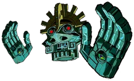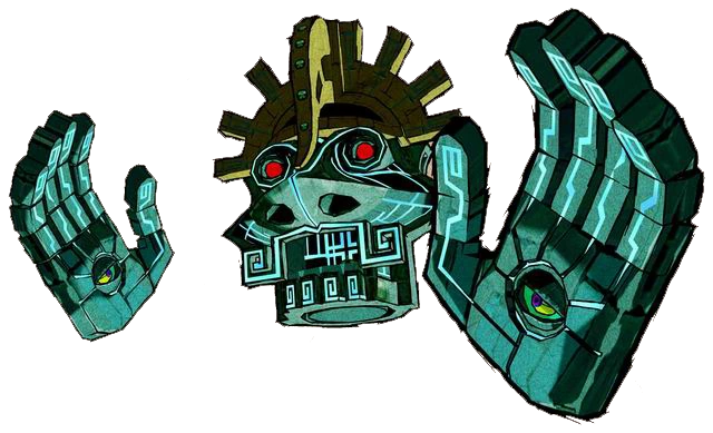 Gohdan consists of a floating stone head and two disembodied hands which hover around it. The head has a gold-colored crest and two piercing red eyes, in addition to a large nose and mouth. The hands each have one glowing green eye in the center of their palms. The entire head and hands are engulfed in pulsating blue energy. Gohdan is similar in appearance and fighting style to Mazaal and Bongo Bongo. Interestingly, it also bears resemblance to Andross and his robotic form from the Star Fox series. Its hands also strongly resemble Eyerok from the Mario series. He also resembles Tiki Tong from Donkey Kong Country Returns.