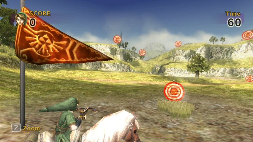 Horseback Target Practice is the first stage of Level 8 in Link's Crossbow Training. This level is a Target Shooting level. Horseback Target Practice is located in Hyrule Field. Pots, scarecrows and skulls are some of the addition items beside the targets that can be shot in this level. In this level, Link rides Epona through Hyrule Field in three sections; morning, evening, and night.