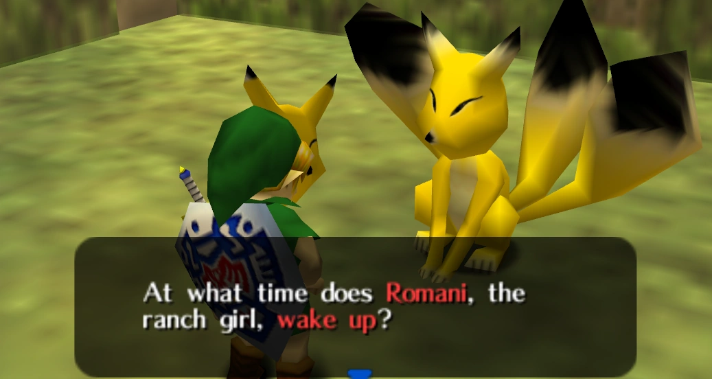In North Clock Town, Milk Road and the Mountain Village, Link finds patches of grass that move about when provoked. If Link destroyed one of these shrubs while wearing the Keaton Mask, Keaton appears and tells Link that he knows he is not a real Keaton. The fox then begins to quiz Link with five questions. If Link can answer all of the randomly selected questions correctly, Keaton gives him a Piece of Heart. If Link receives the Piece of Heart and answers the quiz again on a subsequent time loop, he will receive 20 Rupees instead.