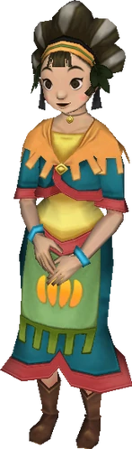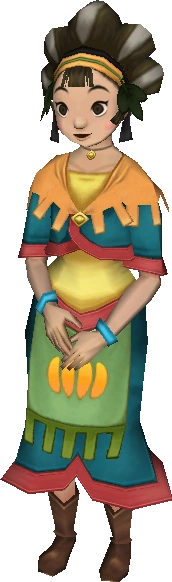 Kina is a character from The Legend of Zelda: Skyward Sword. She is a waitress at the Lumpy Pumpkin and the daughter of the owner, Pumm. She is also a skilled singer, and performs regularly on the stage of the Lumpy Pumpkin. She is well-liked by the patrons of the Lumpy Pumpkin; especially Keet, to whom she is an object of affection.
