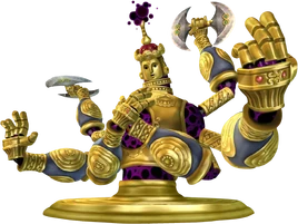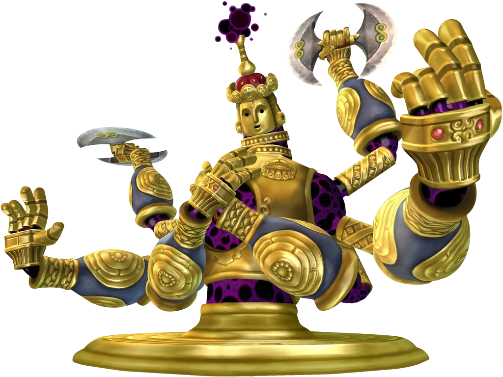Koloktos, Ancient Automaton (魔蝕神器ダ・イルオーマ Mashoku Shinki Da Iruōma?, Evil Defected Spirit Vessel: Da Iruoma), is the boss of the Ancient Cistern, the fourth dungeon in The Legend of Zelda: Skyward Sword. It is a huge golden statue with six arms, two of which hold large Chakram-style curved axes. Koloktos is initially inanimate, but when Link faces it he finds Ghirahim sitting on the statue's head. After stating that Link is persistent, Ghirahim promptly uses his dark magic to bring it to life before vanishing. The statue will often smash its fists down on top of Link in an attempt to crush him, and the hero must use the Whip in order to defeat it. The pieces which make up Koloktos are held together by some form of dark energy provided by Ghirahim.