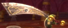 Massive Swords are items from The Legend of Zelda: Skyward Sword. These swords are used in battle by Koloktos, the boss of the Ancient Cistern. During the second phase of the battle against Koloktos, it utilizes six Massive Swords. Using the Whip, Link can disarm Koloktos of one to three of these swords. Link can then proceed to pick up one of the Massive Swords, and use it to destroy the boss' arms, legs, and the barrier guarding its core; due to the sword's size, Link must carry it with both hands, which disables the usage of a shield. When Koloktos reassembles itself, it will summon all six swords back into its hands. If, at any point during the battle, Link should require more hearts, he can use a Massive Sword to destroy one of the pillars in the room, or lure Koloktos into doing the same. One swing of the sword can also kill a Cursed Bokoblin summoned by Koloktos. The Massive Swords remain around Koloktos' remains after the boss' defeat, but cannot be taken outside of the boss room.
