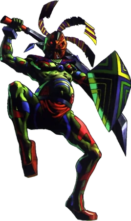 Odolwa is a giant green-skinned humanoid, standing about ten feet tall and wielding a sword nearly as long, as well as a diamond-shaped shield. He wears only a red loincloth, red shoes, and a wooden mask with a snarling face and glowing red eyes behind its sockets. His body is adorned with multiple red and blue tattoos.