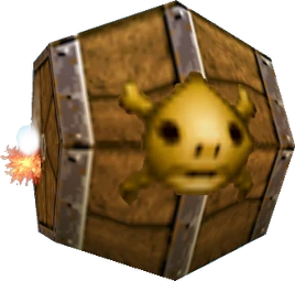 Powder Kegs are items from The Legend of Zelda: Majora's Mask. These heavy, explosive kegs can be wielded only by Gorons, and as such Link must assume his Goron form to use them. Even so, Link's maximum capacity for carrying Powder Kegs is one. Powder Kegs bear the emblem of a modified skull and crossbones, with the skull being that of a Goron.