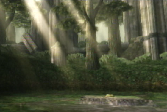 It is also possible that this area is the crippled remains of the original Forest Temple from The Legend of Zelda: Ocarina of Time. The destroyed wall with Spinner tracks greatly resembles the central room in the Forest Temple and the center pillar that the Skull Kid stands atop could be the remains of the central Elevator, with the underground Hidden Hole being the overgrown basement. In addition, Saria's Song is heard while in the grove.
