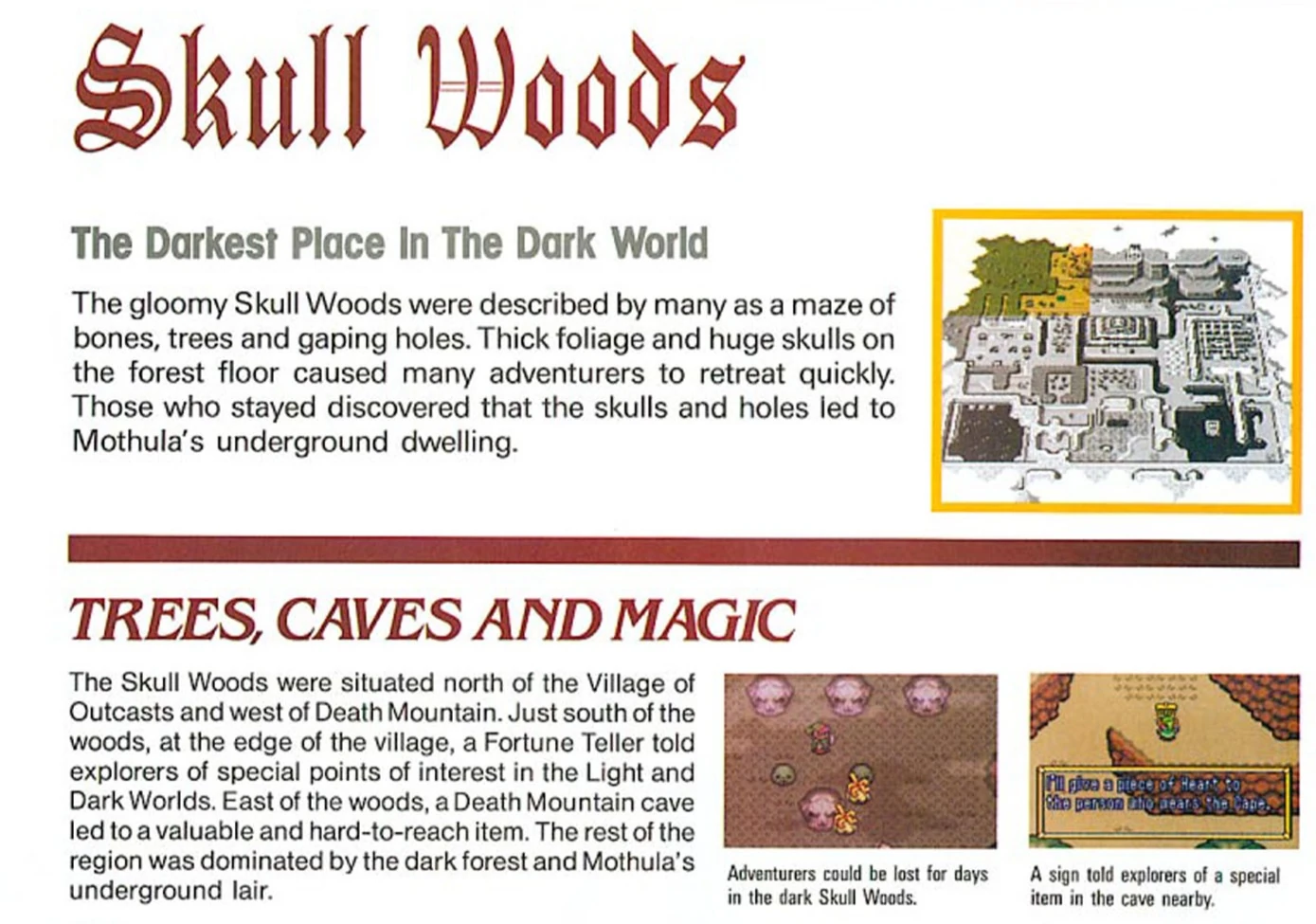 - "The gloomy Skull Woods were described by many as a maze of bones, trees and gaping holes. Thick foliage and huge skulls on the forest floor caused many adventurers to retreat quickly. Those who stayed discovered that skulls and holes led to Mothula's underground dwelling."