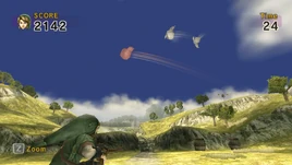 Skull Shooting is the third stage of Level 2 in Link's Crossbow Training. This level is a Target Shooting level. Skull Shooting is located in Hyrule Field. Barrels and scarecrows are some of the addition items beside the skulls, which serve as the targets, that can be shot in this level. The red skulls are worth 100 points while the white ones are only worth 50. The format of this level is reminiscent of skeet shooting, with the skulls acting as the clay pigeon.
