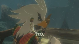 After the exercise has been completed, the two of them head into the sky to fight Vah Medoh. During the battle, Teba assists Link by getting the cannons to focus on him, giving Link an opening to shoot them down. Once the cannons have been taken out, Teba reveals that he was injured during the fight, and thus must return to the Flight Range to rest. He leaves Link to enter the Divine Beast on his own, wishing him luck in the trials waiting for him inside.