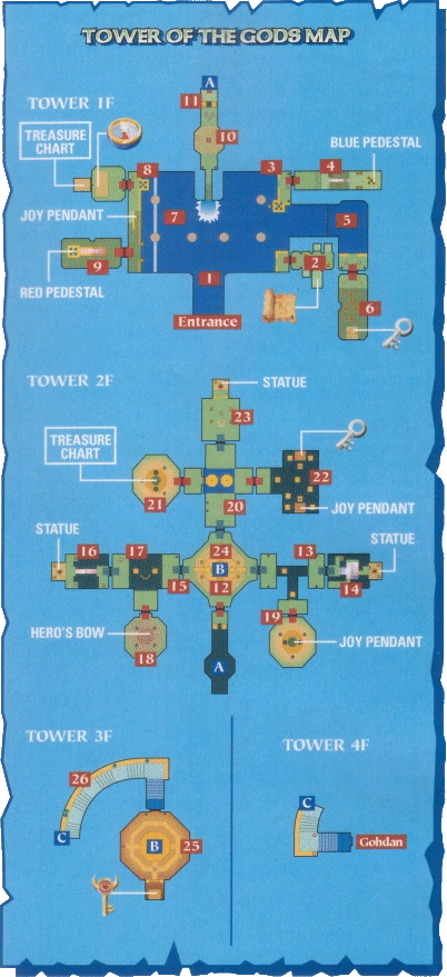 An 8-bit version of the Tower of the Gods appears as two squares on the Great Sea Adventure Mode map. In order to access the tower's top square, the Hookshot Item Card must be used on the Hookshot target located on the tower's bottom square.