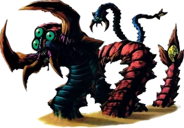 The Twinmold boss consists of two large, segmented worm-like creatures. On each one's head is a pair of large pincers and three large eyes. On their tails, they have what appear to be stingers. The difference in color of the two worms may indicate a difference in gender, like with the Gyorg Pair. If this is the case, we can assume the red one is male and the blue one is female (As in the 3DS version of the game, Tatl refers to the red one as male) Twinmold is one of the largest bosses in the series.